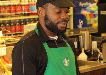 Gregory Mitchell serves coffee at the Starbucks kiosk in the Pack ‘N Save grocery store in Emeryville. At $14.80 per hour, the 27-year-old earns just a bit more than the minimum wage. Although he holds a second job at a local gym and works 45 hours a week, Mitchell struggles to pay his half of the rent for the $1500 apartment in Emeryville he shares with his uncle.