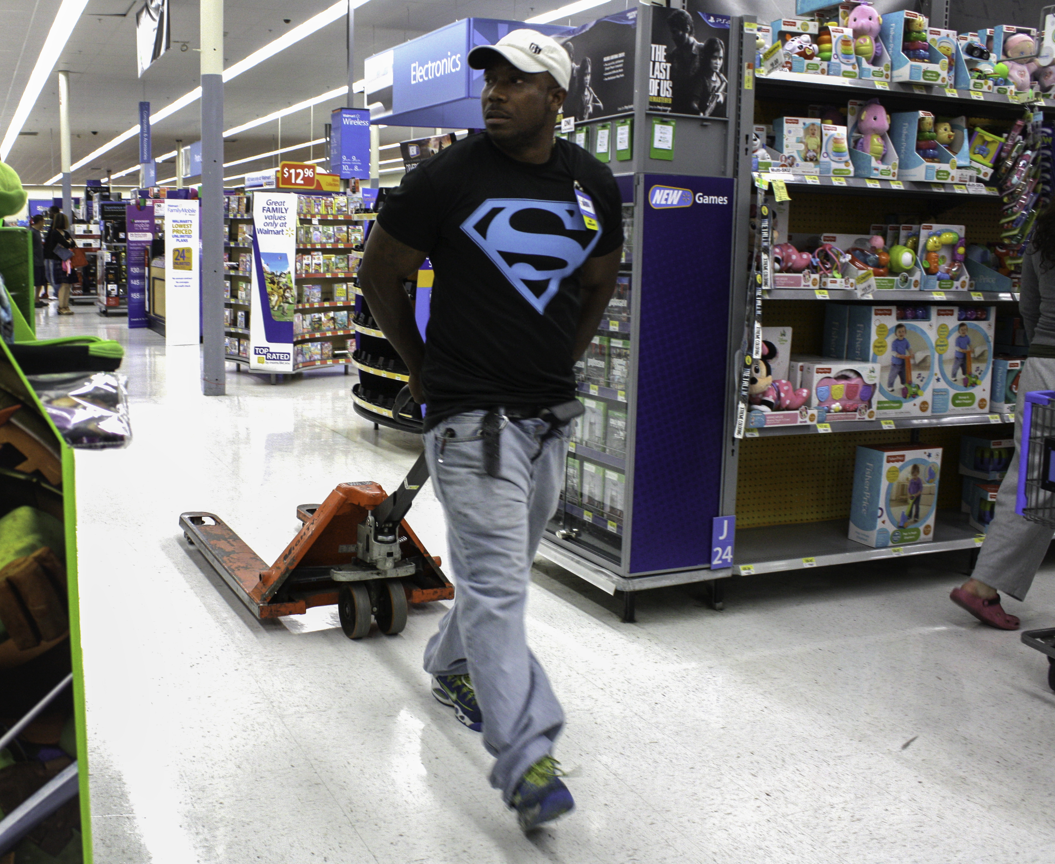 Walmart employee Darryl Randle pulls a pallet jack during his shift. Photo by Marlene Sanchez/Bay News Rising