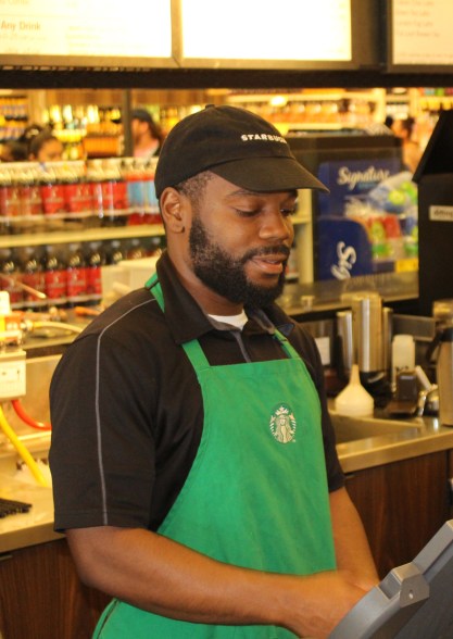 Gregory Mitchell serves a customer at Starbucks in Emeryville. Mitchell has to work two jobs in order to pay his bills. Photo by Brian Howey/Bay News Rising.
