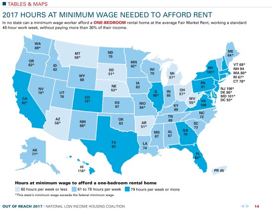 A map generated by the National Low Income Housing Coalition shows state-by-state average hours a minimum wage renter needs to work in order to afford a one-bedroom apartment. Courtesy of the National Low Income Housing Coalition.