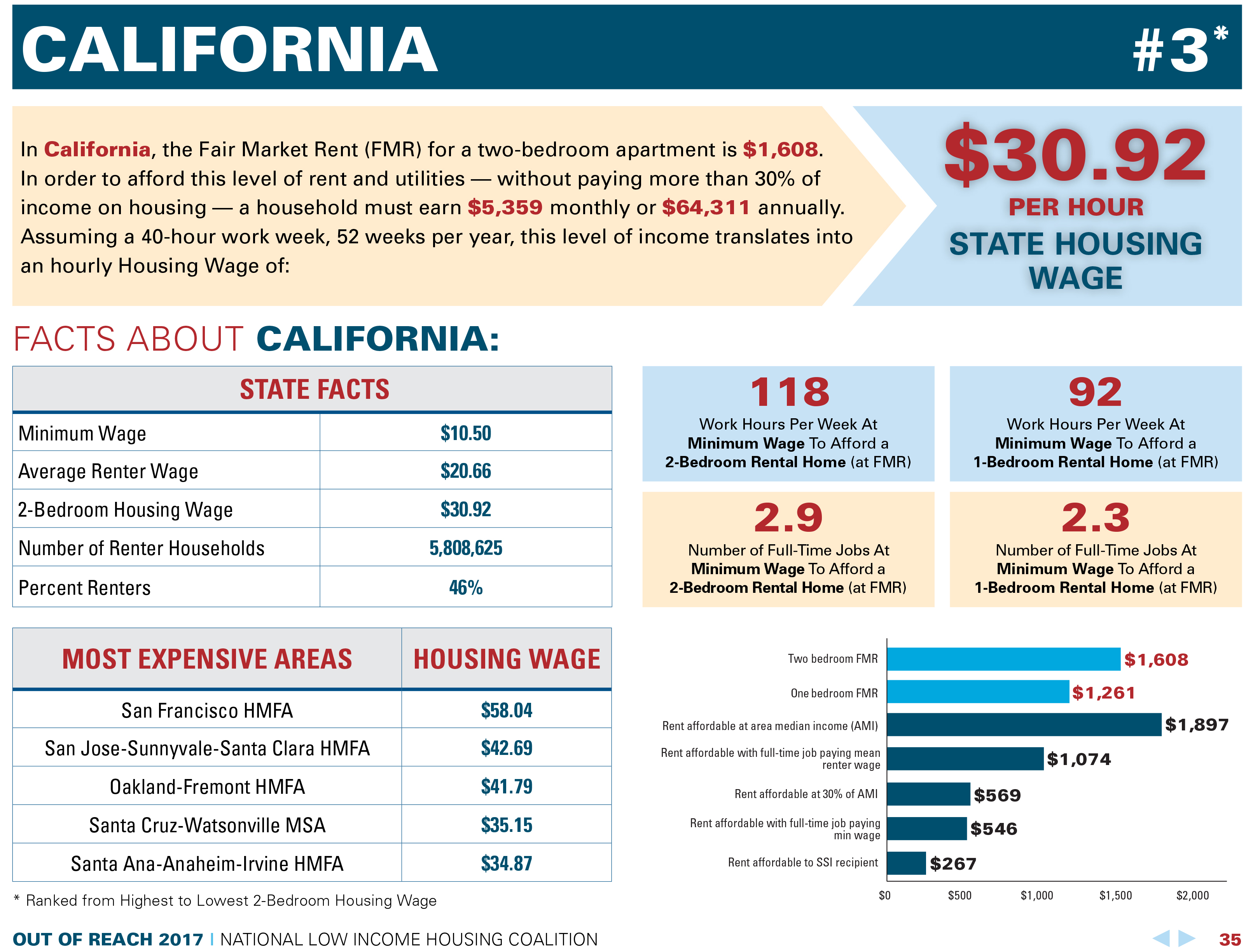 A table shows findings specific to California from the Out of Reach report. Renters earning minimum wage would either have to work 118 hours per week or earn $30.92/hour in order to afford a two bedroom apartment. Courtesy of the National Low Income Housing Coalition.