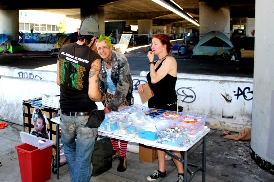 A group of volunteers stands nearby, sporting studs, tight black jeans, and mohawks. This is Punks With Lunch, a patchwork group of friends that offers free weekly meals and a needle exchange for West Oakland’s homeless.