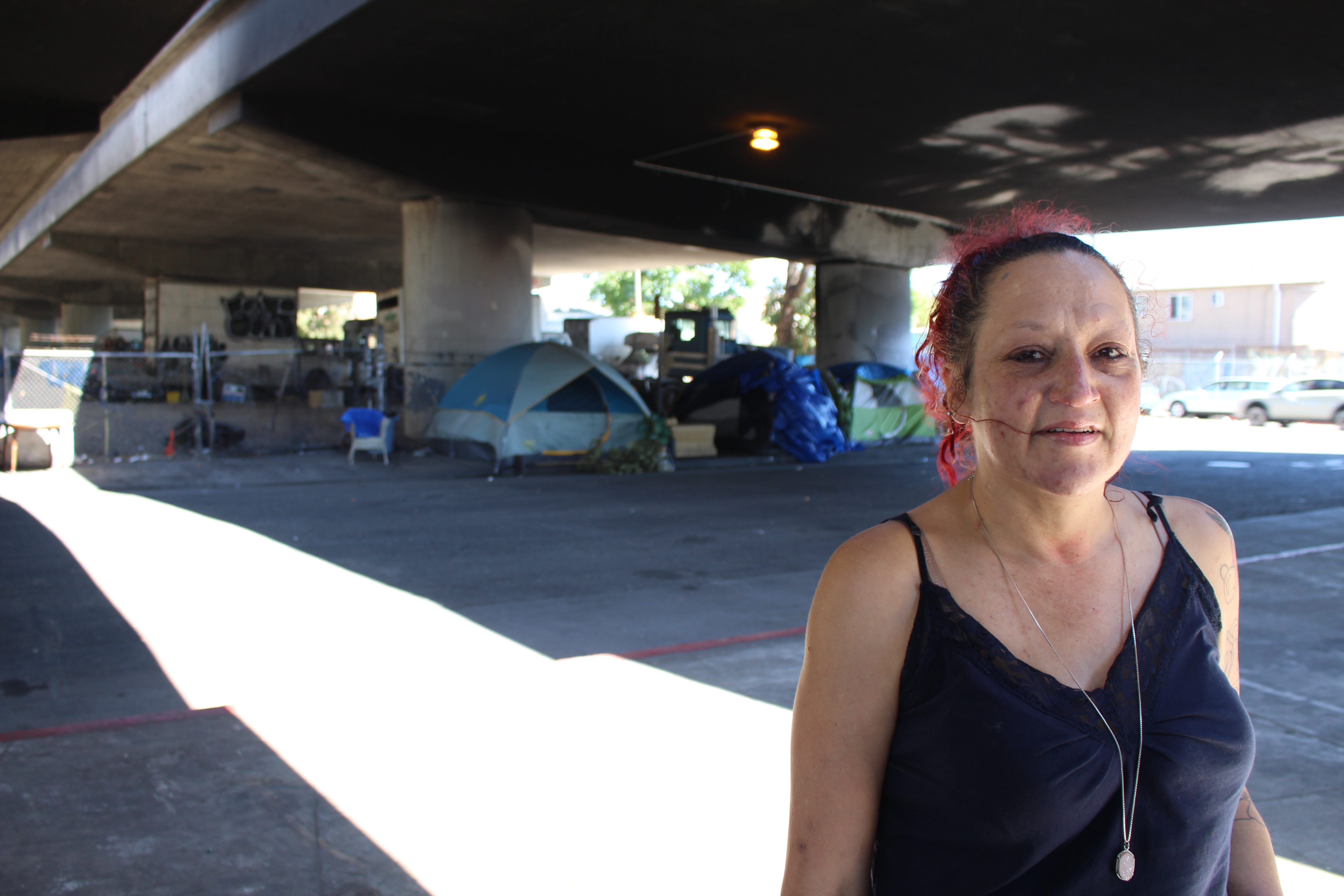 Michele Magobet stands in front of a tent encampment in West Oakland. She and her boyfriend are homeless. Photo by Brian Howey/Bay News Rising.