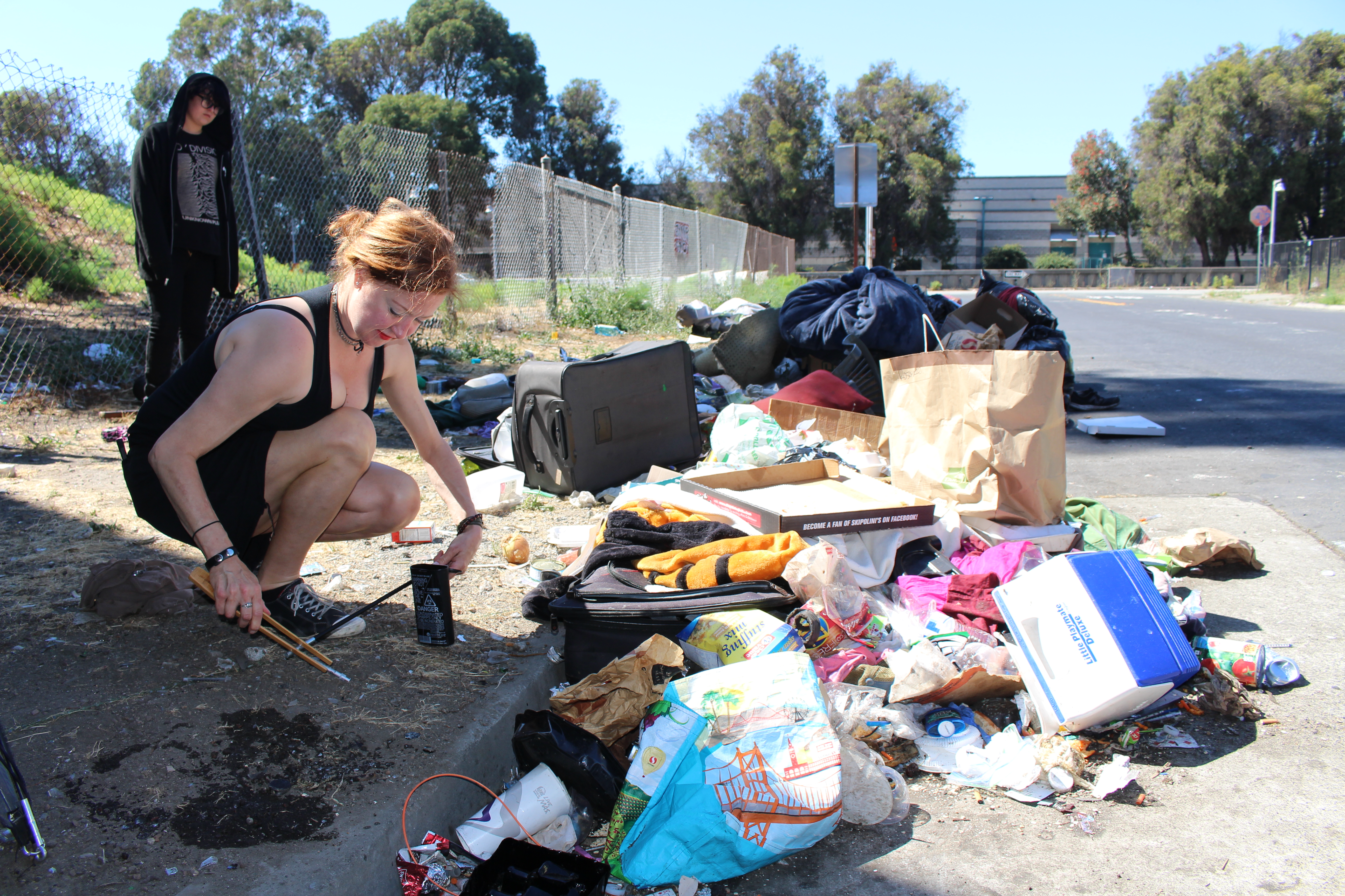 Ben Rubin looks on as his mother, Paula Rubin uses tongs to pick up a used syringe near a tent encampment in West Oakland. Both are Punks With Lunch regulars. Photo by Brian Howey/Bay News Rising.
