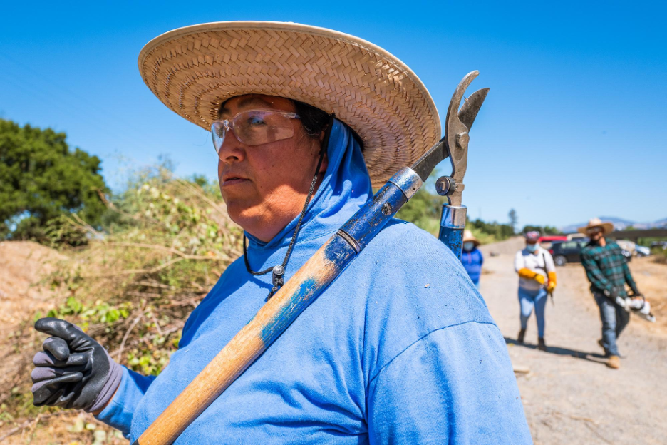 Through the Trabajadores de la Tierra (Land Workers) program, Lopez gets environmental restoration jobs. Workers are hired for their knowledge of land management and train others on best practices. Their most recent job was in Santa Rosa, working with Russian River Keepers to remove overgrown underbrush and invasive plants to prevent deadly fires.