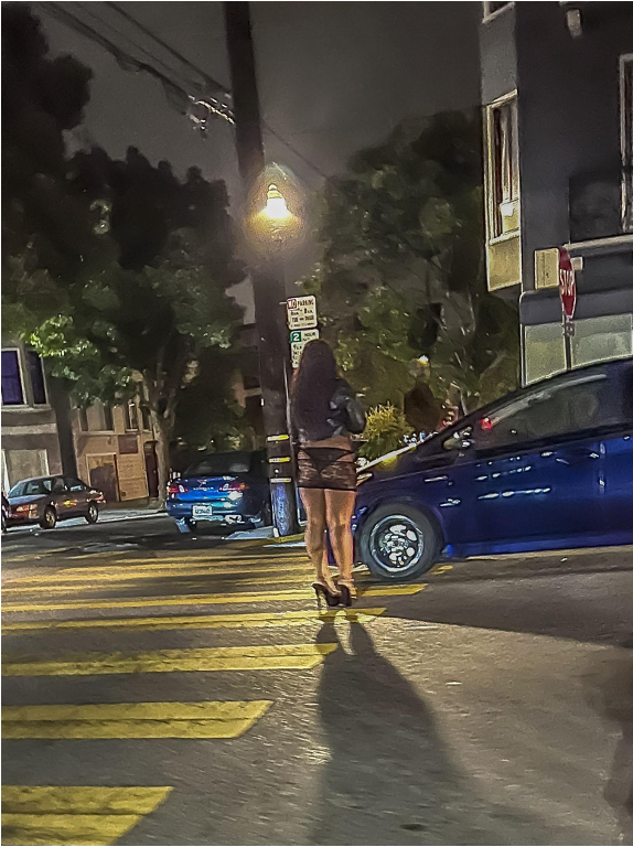 It’s nighttime on Capp Street in San Francisco’s Mission District. Young women wearing not much more than underwear and six-inch heels slowly walk the street. Potential customers drive by slowly and are approached by the women if they roll down a window and show some interest. Parked cars with windows tinted to mask the identity of the drivers line the streets. Those are the pimps, there to keep an eye on their “property.”